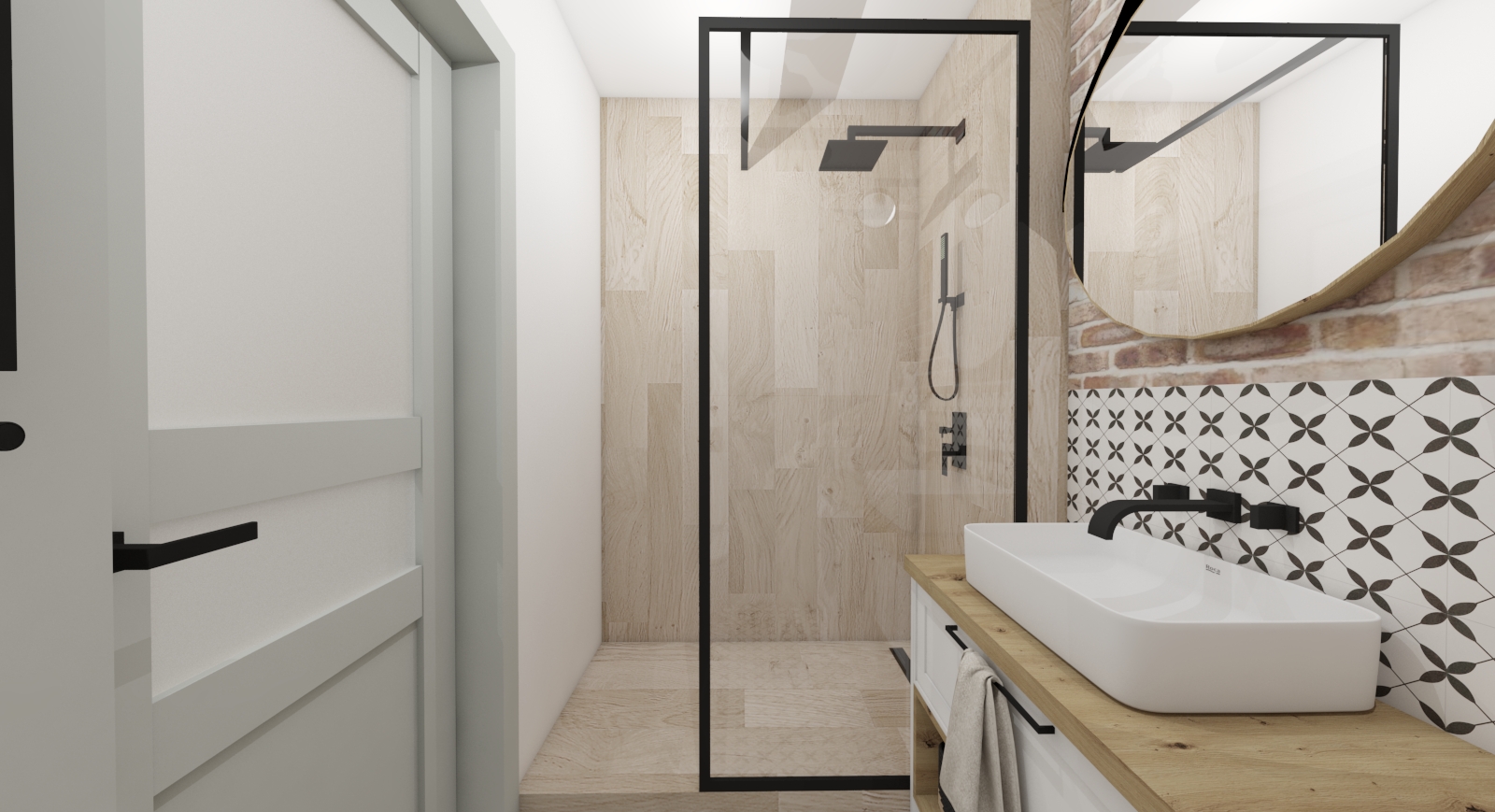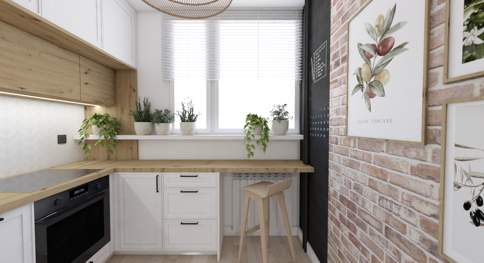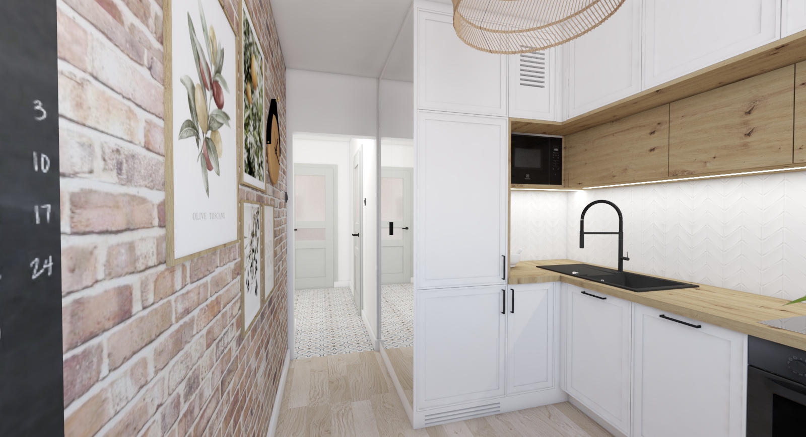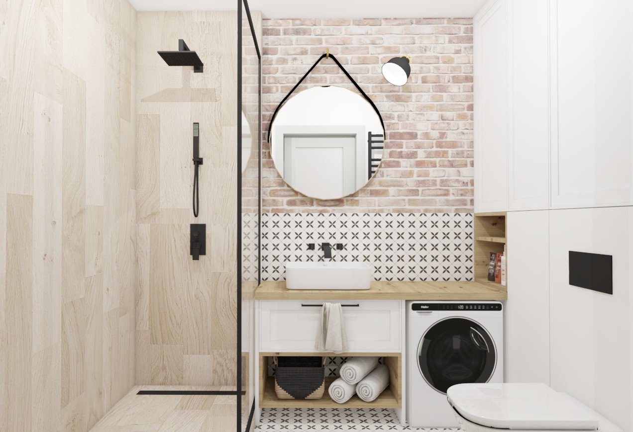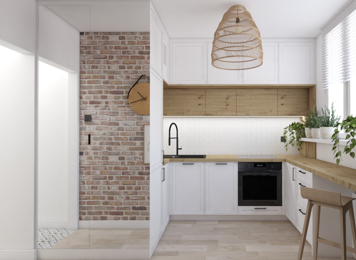 W tym uroczym mieszkaniu mamy dużo elementów stylu boho - naturalne materiały, surowa cegła, drewno, ciepłe barwy. Mała, ale oddzielna kuchnia z maksymalnym wykorzystaniem przestrzeni. Wąskie i długie wejście powiększone optycznie lustrem na zabudowie kuchni. Salon z jadalnią i sypialnią psa ;) Łazienka, która powstała dzięki wyburzeniu ściany poprzedniego układu - małej łazienki i jeszcze mniejszego WC. Po blatem łazienkowym znajduje się specjalnie do tego przeznaczona pomniejszona wersja pralki. Sypialnia z dużym łóżkiem i kojącym widokiem trawy na tapecie wielkoformatowej.