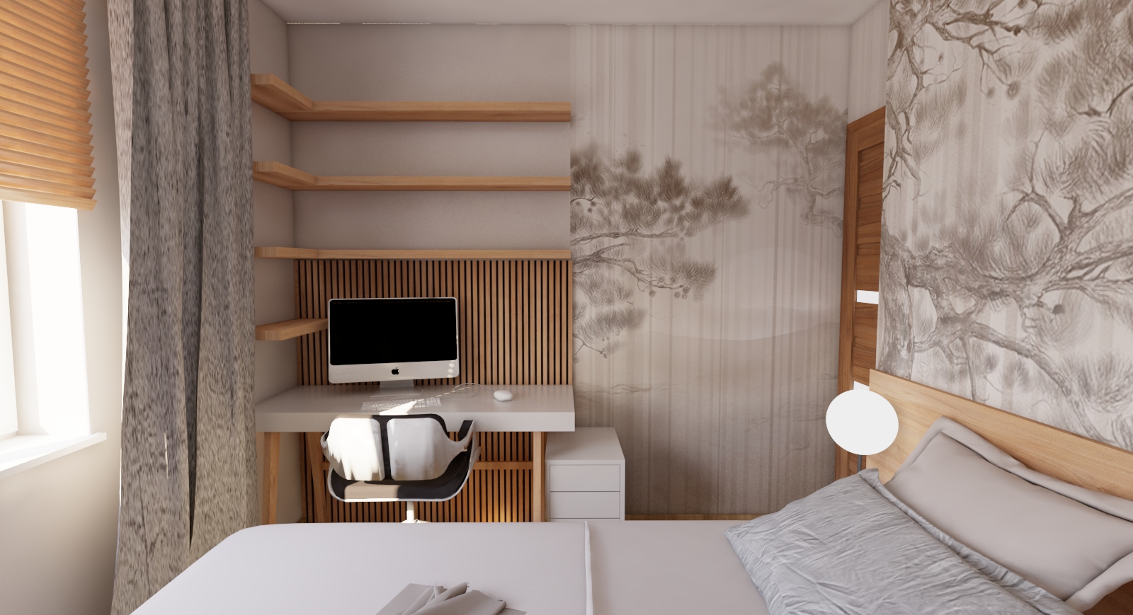Projekt sypialni, która w dobie pracy zdalnej jest również codziennym miejscem pracy. Na tej niewielkiej przestrzeni udało się zmieścić sporej wielkości biurko z półkami na dokumenty i książki, łóżko z materacem szerokości 160 cm oraz szafę przesuwną. Ciekawym elementem wnętrza jest bez wątpienia tapeta w stylu japandi, która wprowadza w spokojny nastrój.