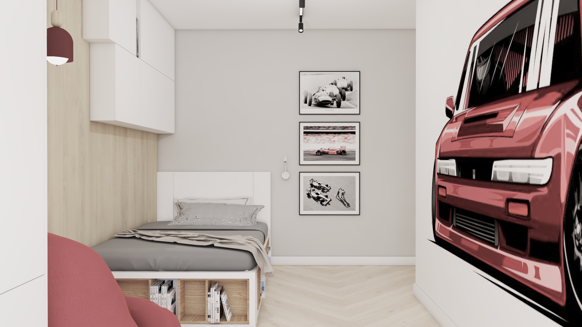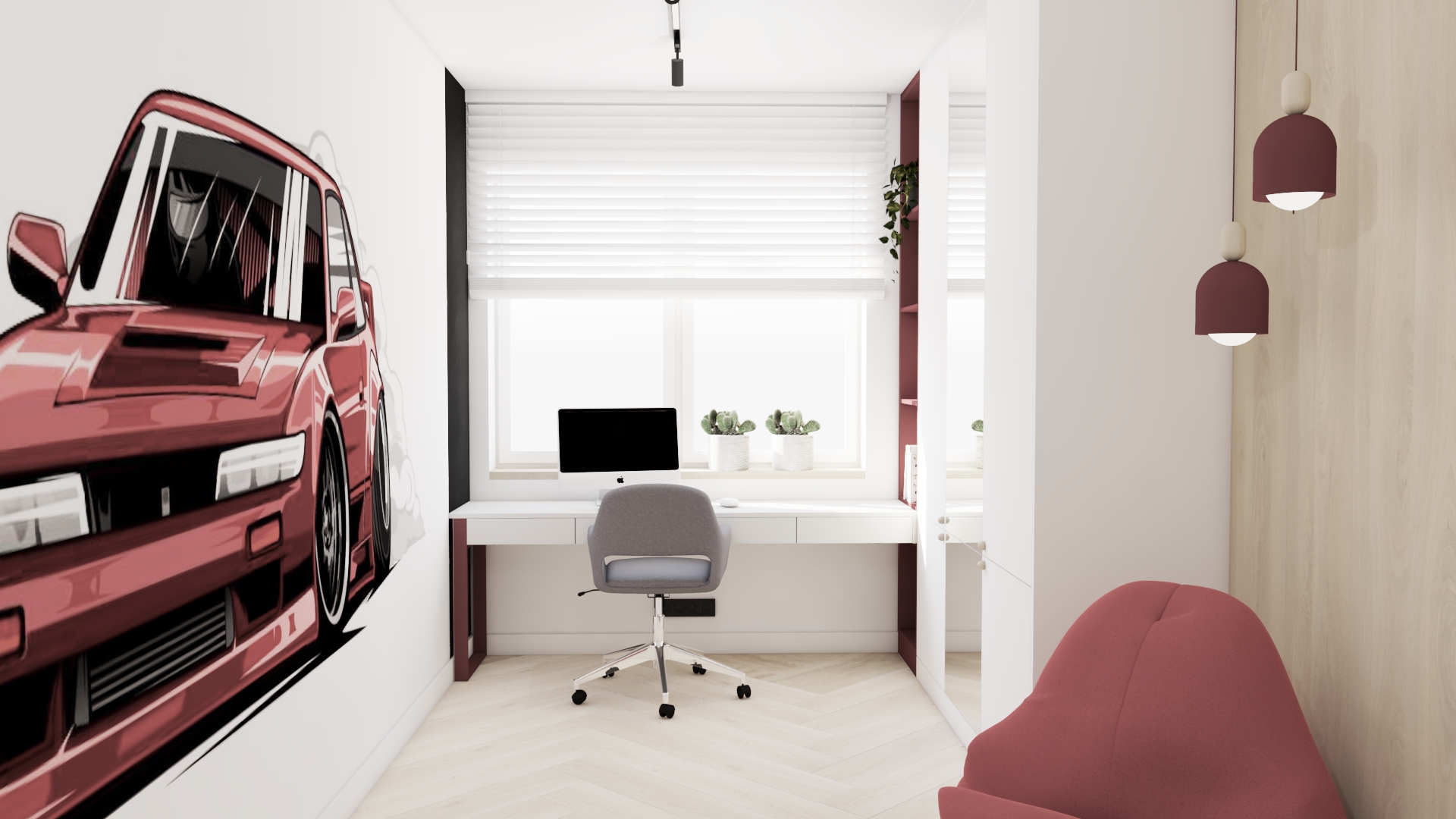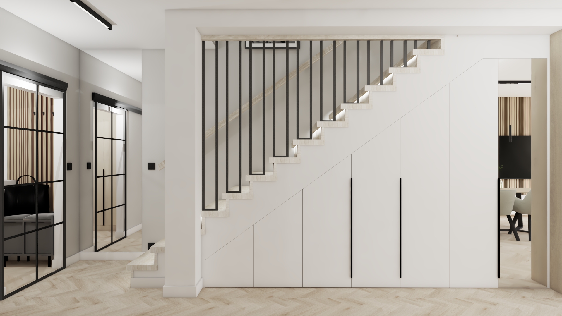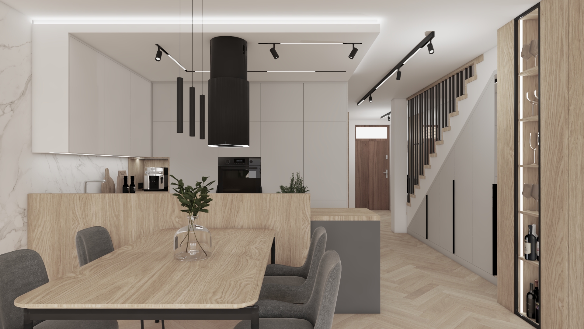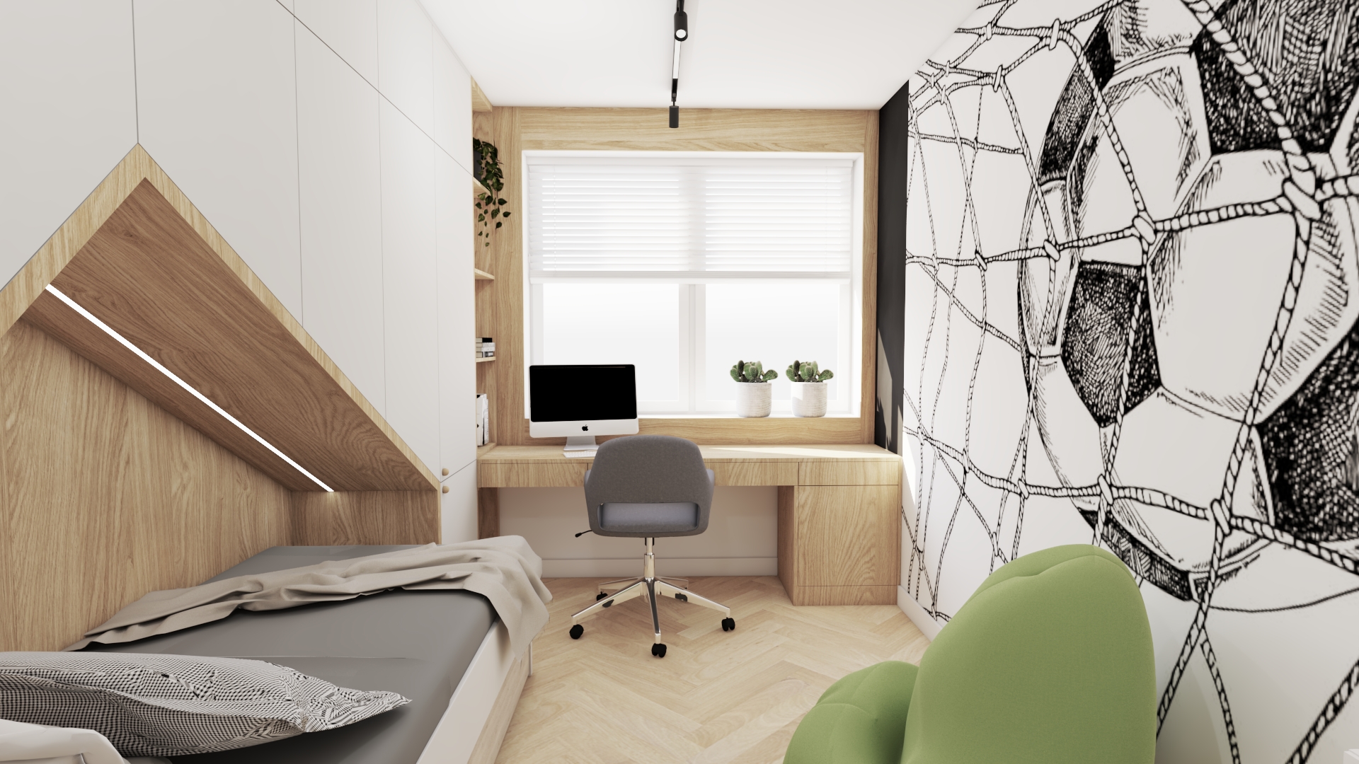 Projekt domu dla rodziny 4-osobowej. Miałam przyjemność zaprojektować tu wszystkie pomieszczenia: - przedpokój z wielką szafą pod schodami, - salon i kuchnię z ukrytym w meblach wejściem do spiżarni, - toaletę dla gości, - łazienkę z ukrytym wejściem do pralni, - pokoje synów - fanów motoryzacji i piłki nożnej, - sypialnię rodziców z miejscem do pracy i czytania książek.