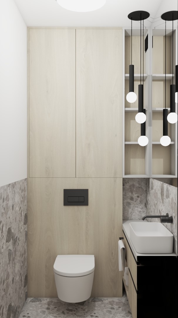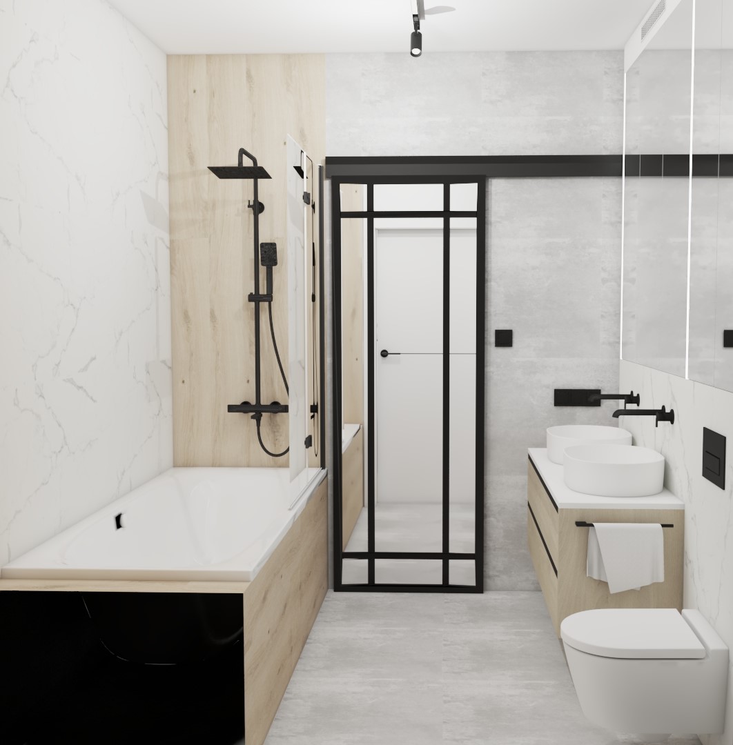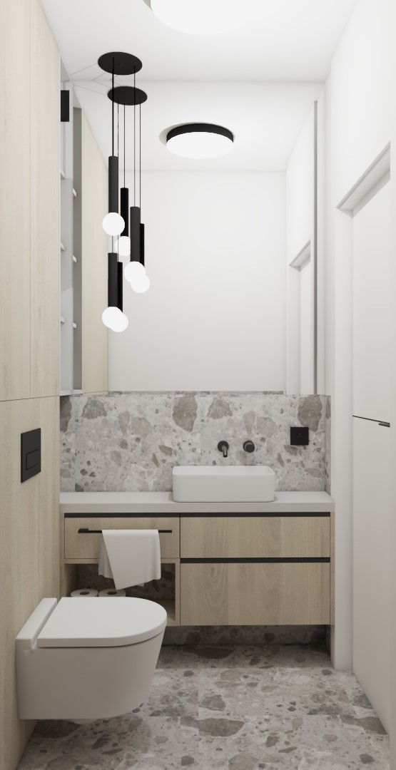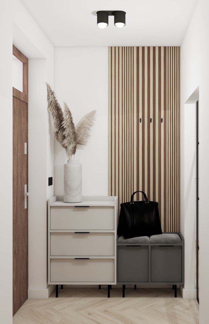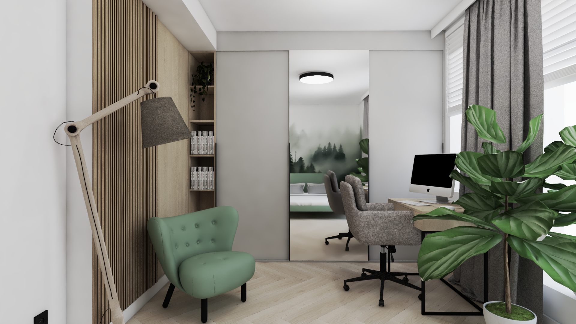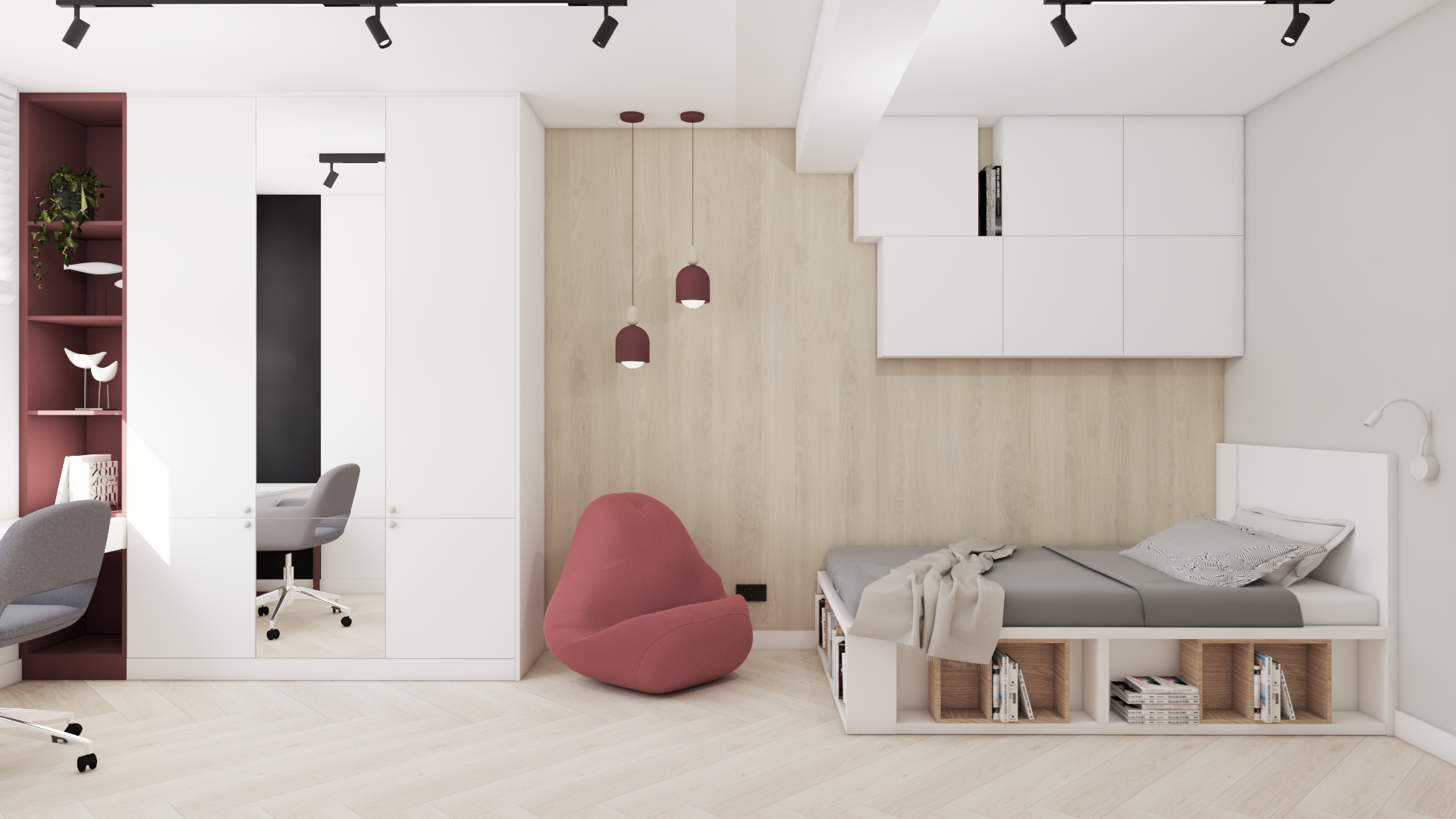 Projekt domu dla rodziny 4-osobowej. Miałam przyjemność zaprojektować tu wszystkie pomieszczenia: - przedpokój z wielką szafą pod schodami, - salon i kuchnię z ukrytym w meblach wejściem do spiżarni, - toaletę dla gości, - łazienkę z ukrytym wejściem do pralni, - pokoje synów - fanów motoryzacji i piłki nożnej, - sypialnię rodziców z miejscem do pracy i czytania książek.