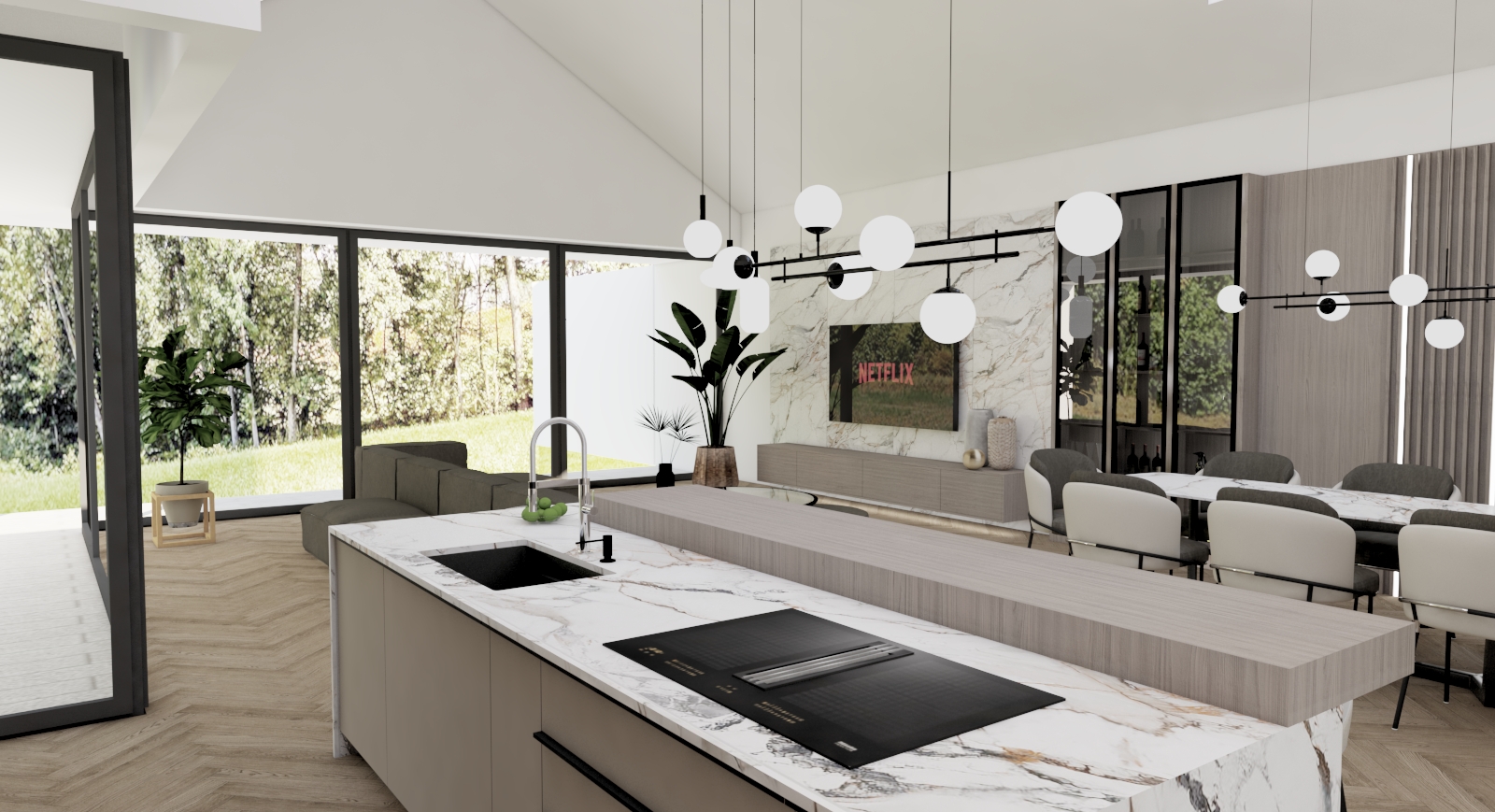 Część dzienna pięknego nowoczesnego domu położonego w sąsiedztwie jeziora. Proste bryły, jasna kolorystyka i czarne akcenty sprawiają, że wnętrze jest minimalistyczne i nie odciąga wzroku od widoków za oknem. Kuchnia bez szafek wiszących, za to z wielką wyspą i ścianą wysokiej zabudowy, w której ukryła się lodówka i zamrażarka do zabudowy, piekarnik, mikrofala, ekspres oraz duże powierzchnie szafek, szuflad i systemów do przechowywania. Okap zintegrowany z płytą grzewczą, daje przestrzeń do zamontowania efektownej lampy nad wyspą.