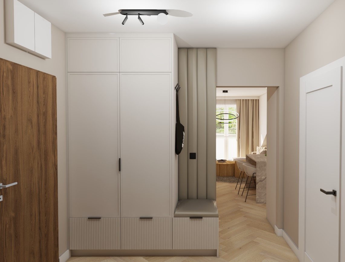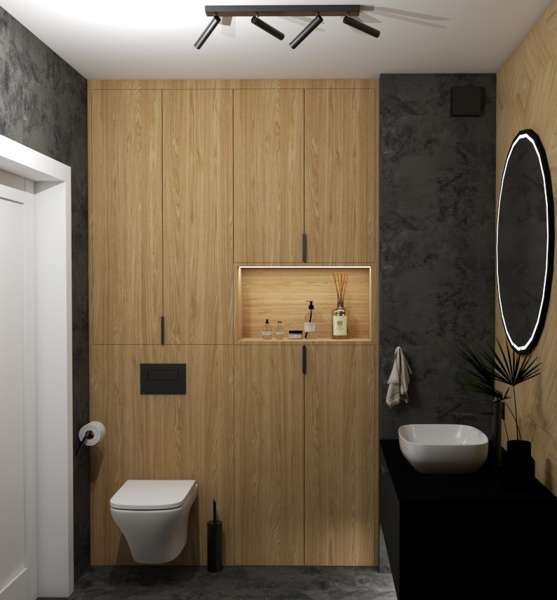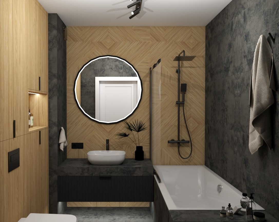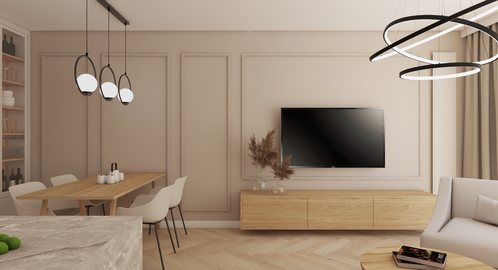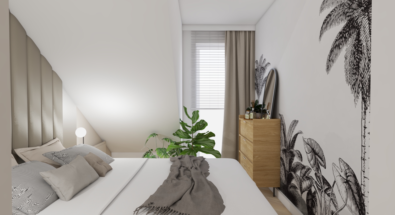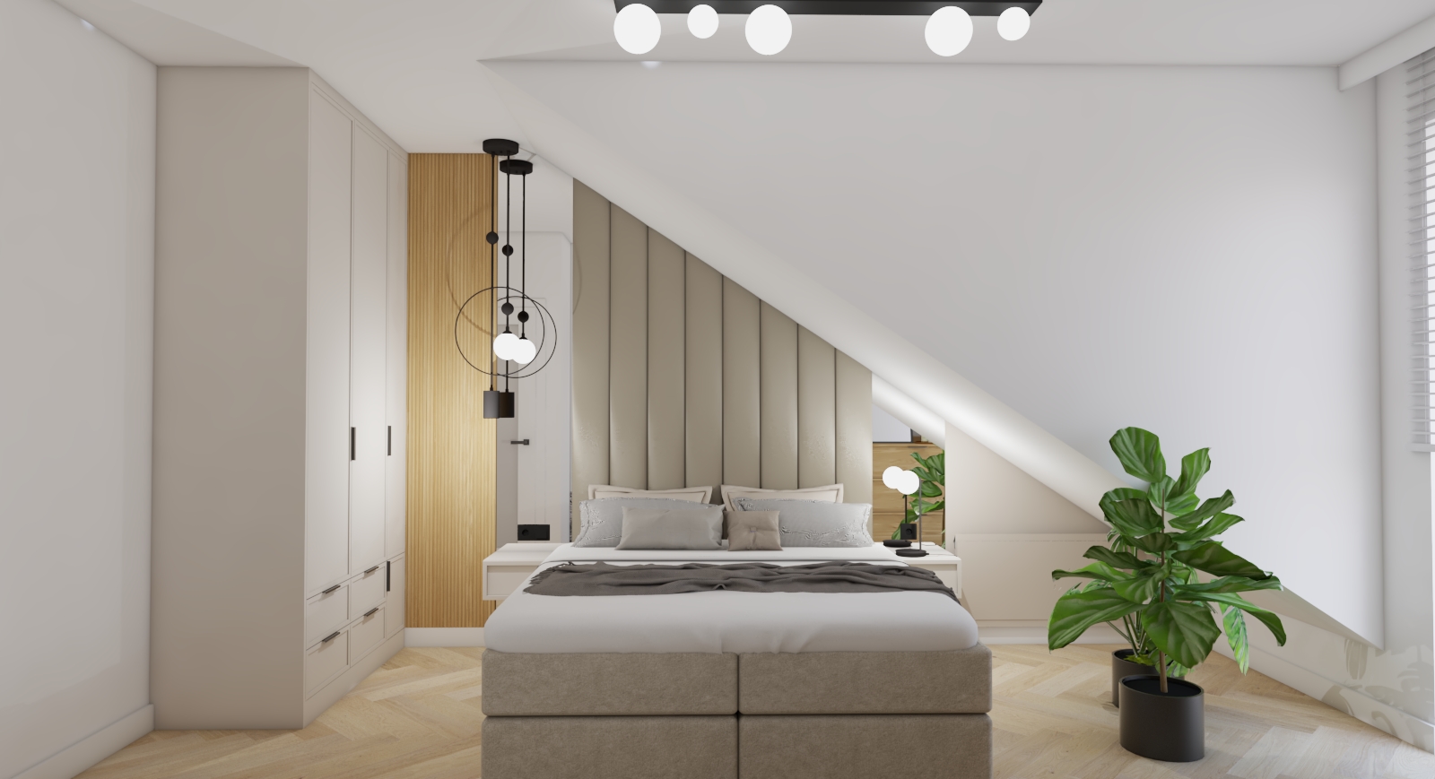 Mieszkanie w stylu modern classic z dominacją jasnych kolorów i ciepłego drewna. Wyjątek stanowi łazienka, w której Inwestor chciał zastosować ciemniejsze kolory. Spójność między wnętrzami dają czarne dodatki oraz ten sam odcień drewna na meblach. Wyzwaniem tego projektu były niełatwe skosy, ale w zaprojektowanej aranżacji nie utrudniają życia mieszkańcom.