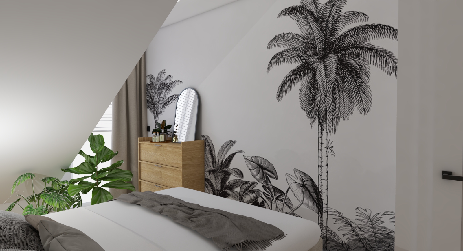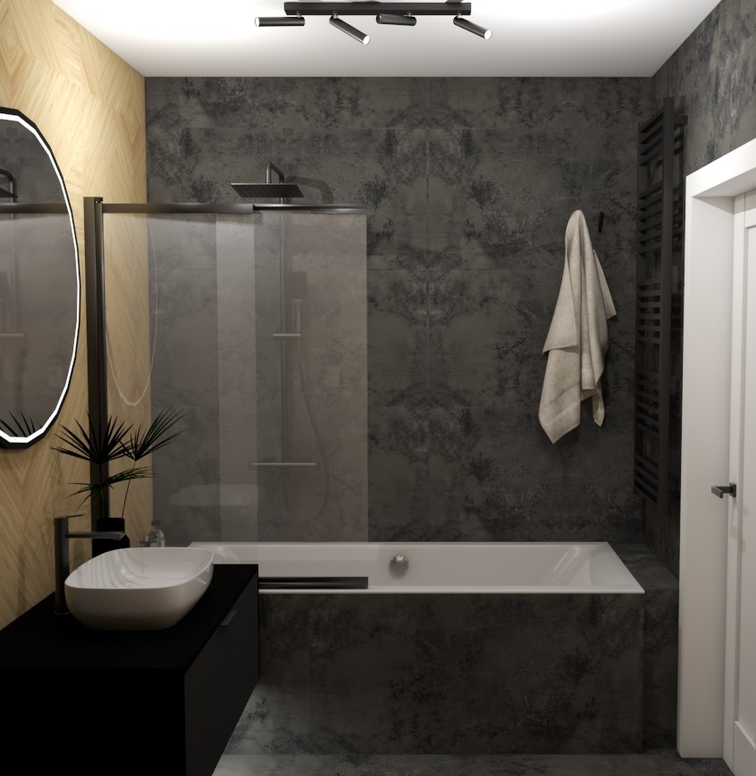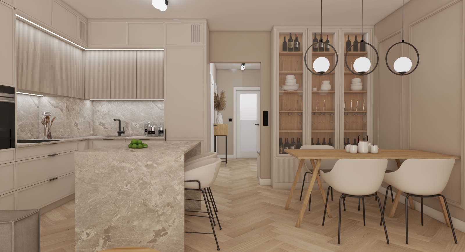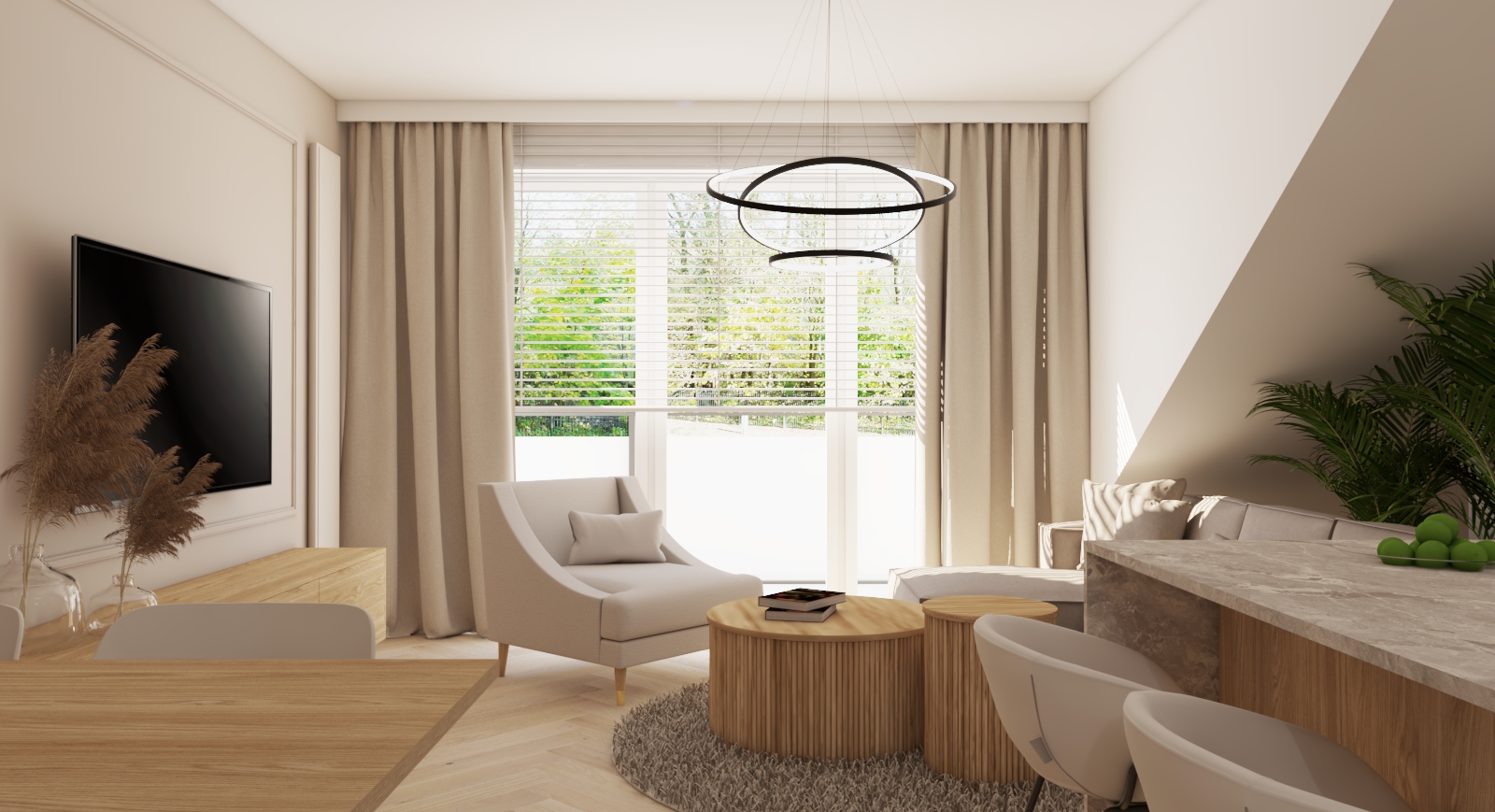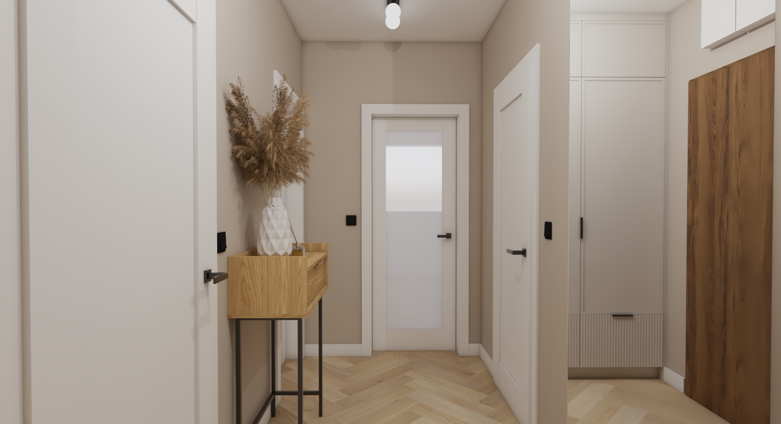 Mieszkanie w stylu modern classic z dominacją jasnych kolorów i ciepłego drewna. Wyjątek stanowi łazienka, w której Inwestor chciał zastosować ciemniejsze kolory. Spójność między wnętrzami dają czarne dodatki oraz ten sam odcień drewna na meblach. Wyzwaniem tego projektu były niełatwe skosy, ale w zaprojektowanej aranżacji nie utrudniają życia mieszkańcom.